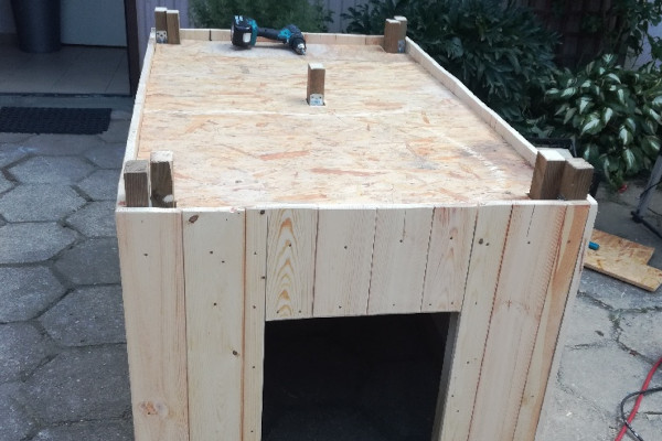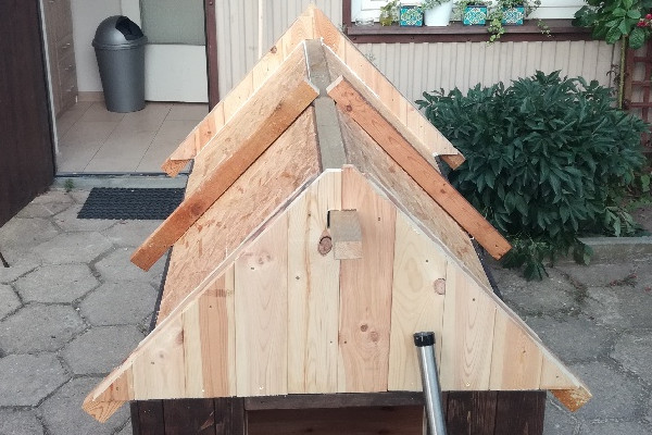 Dach: szkielet tak jak buda z kantówek. Spad z 2 warstw płyty OSB.